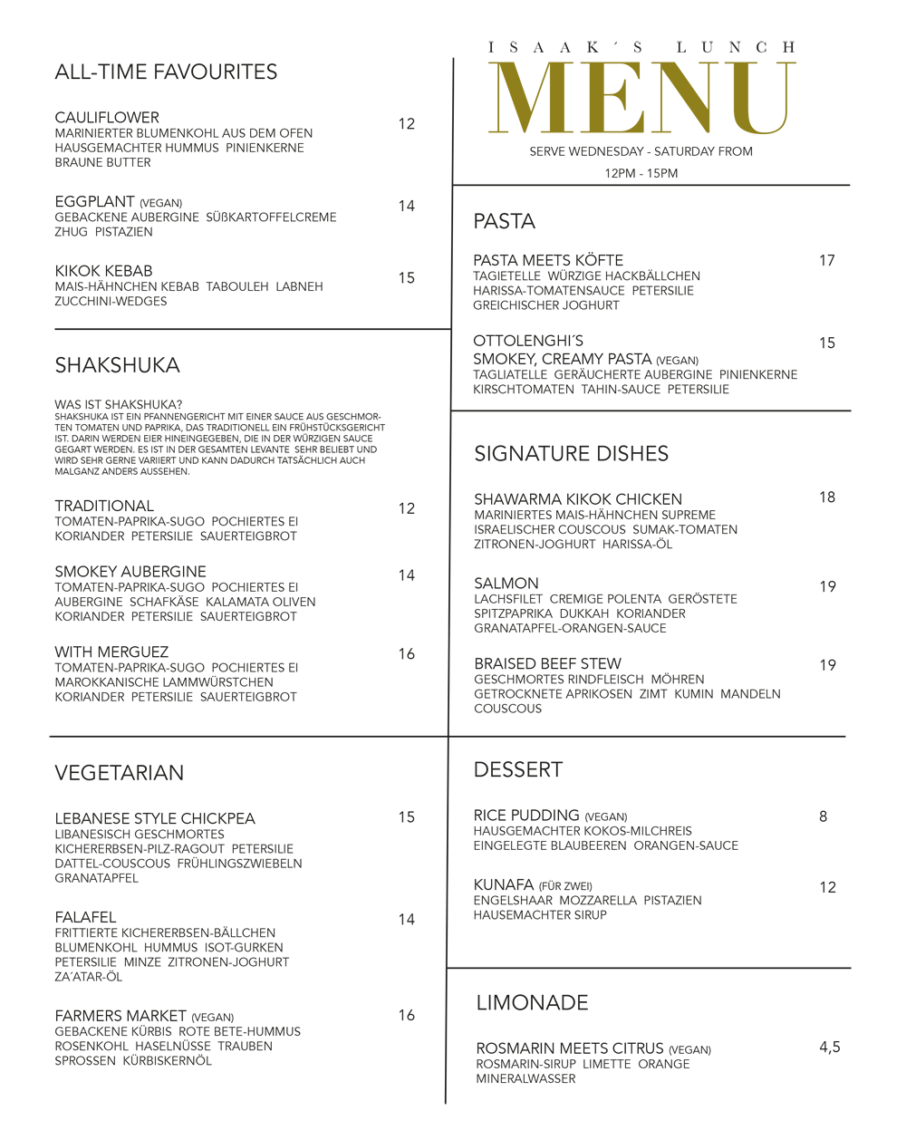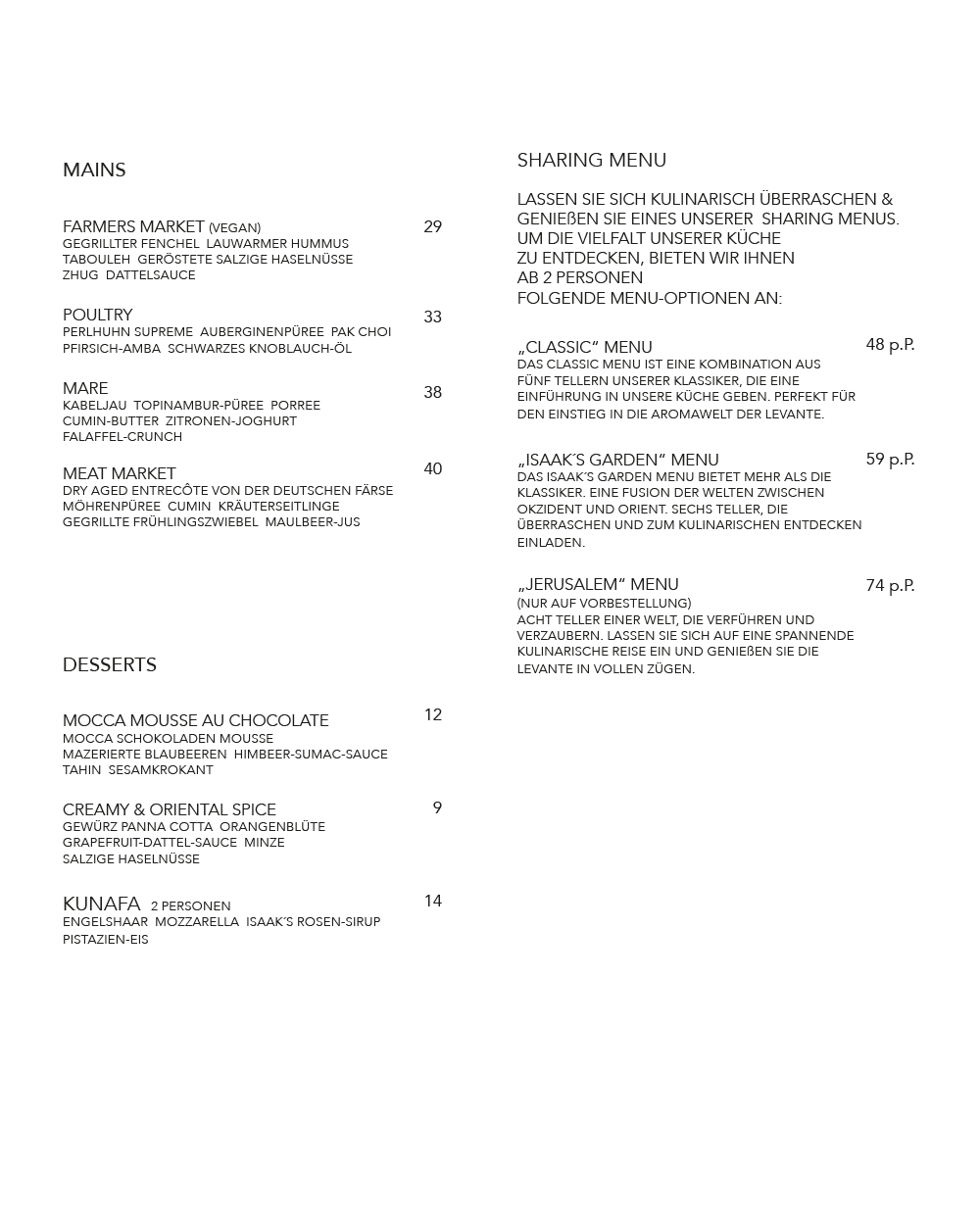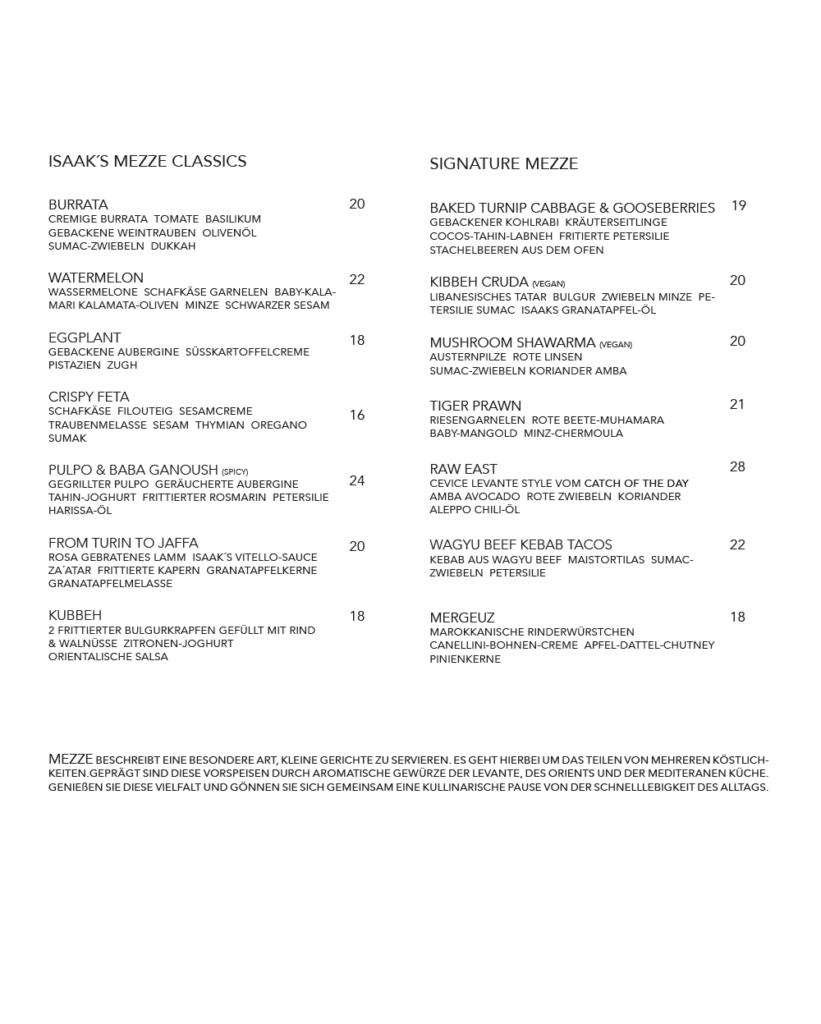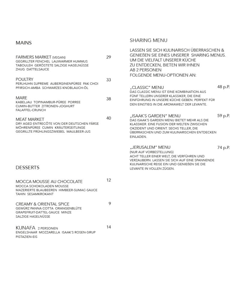 Mit großer Freude nehmen wir Sie in unserem Restaurant Isaak´s Garden mit in die vielfältige levantische Küche und lassen sie dorthin eintauchen. Die Levante „vom östlichen Mittelmeer bis zum nahen Osten“ begeistert mit ihrer Vielfalt und Lebendigkeit. Geprägt von frischen Zutaten, intensiven Gewürzen und vor allem einer jahrhundertealten Tradition des Teilens und Genießens, ist diese art der Kulinarik ein zentraler Bestandteil der Kultur.