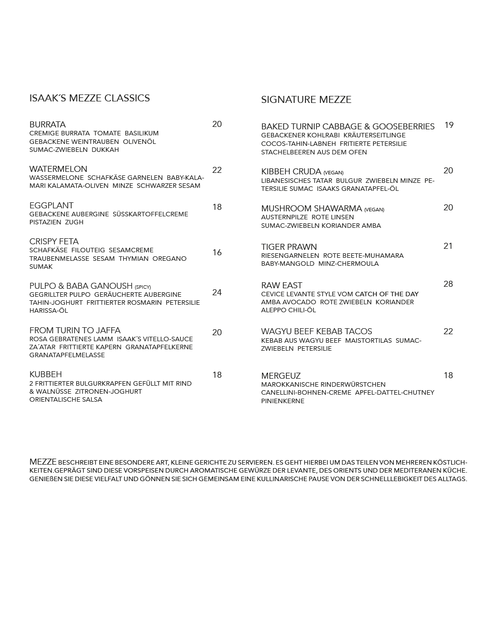 Das gemeinsame Essen mit Familie und freunden wird als festlicher Akt zelebriert, bei dem viele verschiedene Gerichte auf den Tisch kommen und alles miteinander geteilt wir. Im Isaak´s Garden möchten wir Sie einladen, dieses gesellige Miteinander im Ausprobieren von verschiedenen Speisen auch zu erleben. Daher ist ein Teil unserer Gerichte bewusst etwas kleiner gehalten.